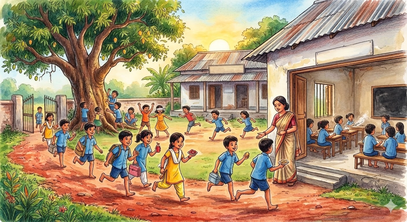 ইস্কুলের গেটে দাঁড়িয়ে থাকা বড় আমগাছটা যেন ছিল আমাদের পাহারাদার। ওর ছায়াতেই প্রথম বন্ধুত্ব, প্রথম মারামারি, প্রথম দুষ্টুমি, গাছে ওঠা ও খুনসুটি। ঘন্টা বাজলেই ছেলেমেয়েরা একসাথে ছুটে যেত মাঠে, কেউ লাফিয়ে বল ধরত, কেউ দৌড়াদৌড়ি- কানামাছি- বরফ পানি খেলা, কেউ ঝগড়া করে কেঁদে ফেলত, আর সেই কান্নার মাঝেই আবার হাসি ফুটে উঠতো ঠিক রোদের মধ্যে উজ্জ্বল এক তারা।