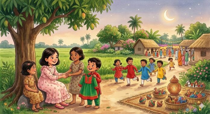 রাইসা বলল, আমি বড় হয়ে একটা বড় চাকরি করব। তখন অনেক টাকা আয় করব। মা হেসে বললেন, তারপর? রাইসা বলল, তারপর প্রতি ঈদে গ্রামের সব বাচ্চাকে নতুন জামা কিনে দেব। যেন কেউ আর পুরনো জামা পরে বসে না থাকে। মায়ের চোখ ভিজে উঠল। তিনি রাইসাকে বুকে জড়িয়ে ধরলেন। পরদিন ঈদের সকাল এল। গ্রামের সব বাচ্চা নতুন জামা পরে আনন্দে মেতে উঠল। কেউ মাঠে দৌড়াচ্ছে। কেউ মিষ্টি খাচ্ছে। কেউ বন্ধুদের সাথে খেলছে।