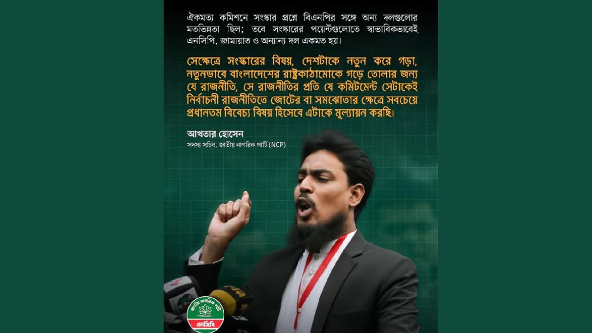 জামায়াতের সঙ্গে জোট বা সমঝোতার ব্যাখ্যা দিয়ে আখতার বলেছেন, ‘ঐকমত্য কমিশনে সংস্কার প্রশ্নে বিএনপির সঙ্গেই অন্য দলগুলোর মতভিন্নতা পরিলক্ষিত হতো। সেখানে সংস্কারের পয়েন্টগুলোতে ন্যাচারালি (স্বাভাবিকভাবেই) এনসিপি, জামায়াত এবং অন্য দলগুলো একমত হয়েছে। সেক্ষেত্রে সংস্কারের বিষয়, দেশটাকে নতুন করে গড়া, নতুনভাবে বাংলাদেশের রাষ্ট্রকাঠামোকে গড়ে তোলার জন্য যে রাজনীতি, সে রাজনীতির প্রতি যে কমিটমেন্ট সেটাকেই নির্বাচনী রাজনীতিতে জোটের বা সমঝোতার ক্ষেত্রে সবচেয়ে প্রধানতম বিবেচ্য বিষয় হিসেবে এটাকে মূল্যায়ন করছি।’