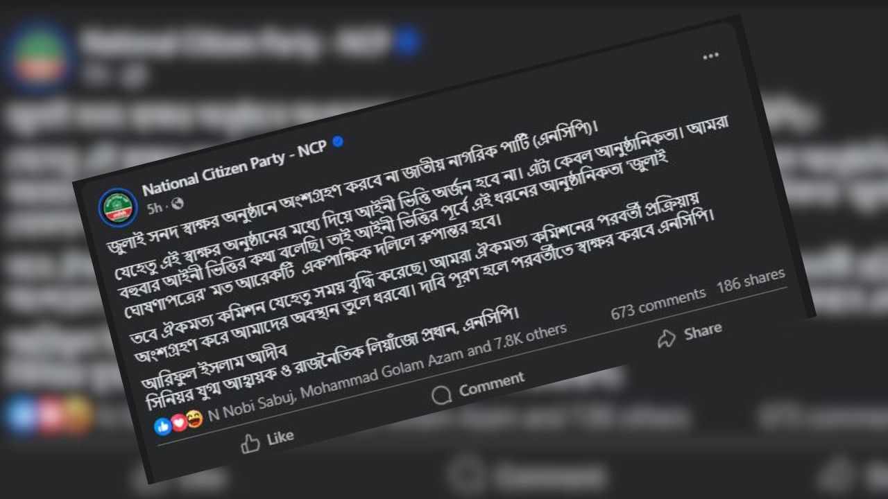 আরো বলা হয়, ঐকমত্য কমিশন যেহেতু সময় বৃদ্ধি করেছে, এনসিপি কমিশনের পরবর্তী প্রক্রিয়ায় অংশগ্রহণ করে নিজেদের অবস্থান তুলে ধরবে। দাবি পূরণ হলে, পরবর্তীতে এনসিপি স্বাক্ষর প্রক্রিয়ায় অংশগ্রহণ করবে।
