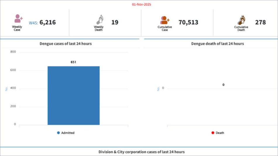 শুক্রবার সকাল ৮টা থেকে শনিবার সকাল ৮টা পর্যন্ত (একদিনে) ডেঙ্গু আক্রান্ত হয়ে আরও ৬৫১ জন রোগী হাসপাতালে ভর্তি হয়েছেন। এ নিয়ে চলতি বছর ভাইরাসটিতে আক্রান্ত হয়ে হাসপাতালে ভর্তি হওয়া রোগীর সংখ্যা ৭০ হাজার ছাড়াল। তবে গত ২৪ ঘণ্টায় ভাইরাসটিতে আক্রান্ত হয়ে নতুন করে কারো মৃত্যু হয়নি।