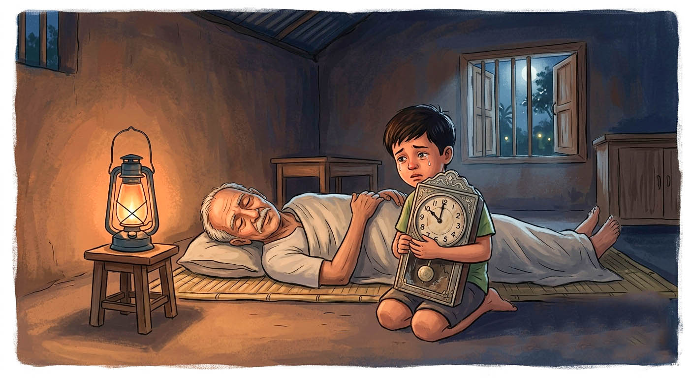 তপু অবাক হয়ে বলল, মনের কথা কেমনে কয় দাদু? দাদু দেয়ালঘড়িটার দিকে তাকিয়ে রইলেন। দাদুর চোখে কেমন জল চিকচিক করছে। দাদু বললেন, এই ঘড়িটা তোর দিদার খুব আদরের ছিল রে! নিজ হাতে দম দিত। বলত, ঘড়ি বন্ধ হওয়া মানে ঘরের প্রাণ থেমে যাওয়া। তপু ধীরে ধীরে খাট থেকে নেমে এসে দাদুর গা ঘেঁষে বসল। বলল, দিদা তো অনেক আগেই আকাশে চলে গেছেন! তাই না? দাদু মাথা নাড়লেন। বললেন, হ্যাঁ রে। কিন্তু এই ঘড়ির মধ্যে তার হাতের ছোঁয়া রইয়া গেছে। কথাটি বলেই দাদু অন্য দিকে তাকালেন। বাইরে হাওয়া উঠল। জানালার কাঠ কেঁপে উঠল। তপু ফিসফিস করে বলল, দাদু আজ ঘড়িটা কেমন জানি শব্দ করছে। মনে হচ্ছে ঘড়িটি কান্না করছে। দাদু এবার দীর্ঘশ্বাস ফেললেন। বললেন, আজ তোর বাবার মৃত্যু দিবস রে তপু! আজ তোর বাবার মৃত্যু দিবস! তপু হঠাৎ থমকে গেল। তার ছোট্ট বুকটা কেঁপে উঠল। সে বাবাকে ঠিকমতো মনে করতে পারছে না। শুধু মনে আছে, বাবা খুব সাধারণ মানুষ ছিলেন। হাসিখুশি প্রাণবন্ত। তারপর মাও চলে গেলেন দূরের শহরে চাকরিতে। তপু তখন থেকেই দাদুর কাছেই বড় হচ্ছে।