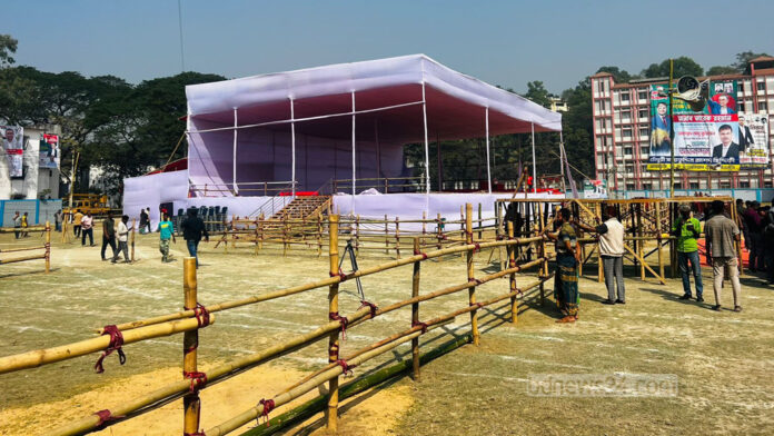 শনিবার (২৪ জানুয়ারি) মঞ্চ নির্মাণ, সাউন্ড সিস্টেম, বিদ্যুৎ সংযোগ, ব্যানার-ফেস্টুন স্থাপনসহ সার্বিক ব্যবস্থাপনা প্রায় সম্পন্ন হয়েছে।