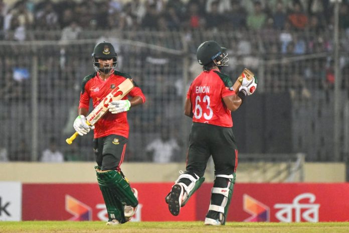 দলকে জিতিয়েই মাঠ ছেড়েছেন ইমন। জয়সূচক চার আসে জাকের আলী অনিকের ব্যাট থেকে। ২৭ বল হাতে রেখে ৭ উইকেটের জয় তুলে নেয় বাংলাদেশ। চট্টগ্রাম লিগে ইস্পাহানি ক্রিকেট একাডেমিতে হাতেখড়ি নেয়া নোয়াখালীর ছেলে ইমন ৩৯ বলে ৫৬ রান করে অপরাজিত ছিলেন। সতীর্থ জাকের অপরাজিত ছিলেন ১০ বলে ১৫ রান করে। পাকিস্তানের হয়ে ২ উইকেট শিকার করেন সালমান মির্জা। ১ উইকেট নেন আব্বাস আফ্রিদি। এর আগে প্রথম ব্যাট করতে নেমে স্বাগতিক বোলারদের দাপটে ১১০ রানে থামতে হয় পাকিস্তানকে। মিরপুরের শেরে বাংলা জাতীয় ক্রিকেট স্টেডিয়ামে একের পর এক উইকেট হারিয়েছে তারা। দলের ১৮ রানের মাথাতে ৪ বলে ৬ রান করা সাইম আইয়ুবকে দিয়ে শুরু। সাইমকে ফেরান তাসকিন আহমেদ। এরপর একে একে সাজঘরে ফিরে যান মোহাম্মদ হারিস, সালমান আলী আঘা, হাসান নওয়াজ। পাওয়ারপ্লের মধ্যে ৪ উইকেট হারিয়ে ফেলে পাকিস্তান। তখন স্কোরবোর্ডে রান ছিল ৪১। পাওয়ারপ্লে শেষে আউট হন মোহাম্মদ নওয়াজ। ৫ বলে ৩ রান করেন নওয়াজ। ৪৬ রানের মধ্যে হাওয়া ৫ উইকেট। শুরুর ৬ ব্যাটারের মধ্যে দুই অঙ্ক ছুঁয়েছেন কেবল টিকে থাকা ওপেনার ফখর জামান। এক প্রান্ত আগলে রেখে খেলেছেন ফখর। ৩৪ বলে ৪৪ রান করে দলের ৭০ রানের মাথাতে থামেন ফখর জামান। শেষ দিকে ২৩ বলে ১৭ রানের ইনিংস খেলেছেন খুশদিল শাহ। আব্বাস আফ্রিদিও ঝড়ের আভাস দিয়েছেন। তবে ২৪ বলে ২২ রান করে শেষ ব্যাটার হিসেবে আউট হন তিনি। ১৯.৩ ওভার শেষে ১১০ রানে গুটিয়ে যায় পাকিস্তানের ইনিংস। বাংলাদেশের তাসকিন ২২ রানে ৩ ও মুস্তাফিজুর রহমান ৬ রানে ২ উইকেট শিকার করেন। তানজিম হাসান সাকিব ২০ ও এবং শেখ মেহেদী হাসান ৩৭ রানে নেন ১টি করে উইকেট। তিনজন হয়েছেন রান আউটের শিকার। আগামীকাল সিরিজের দ্বিতীয় ম্যাচ অনুষ্ঠিত হবে।