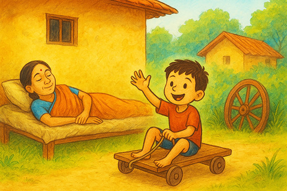হঠাৎ করেই তার মনে পড়ে যায় সেই দিনগুলো। বিকেলের আলোয় মা দড়ি বাঁধে, একটা পিড়ি দিয়ে তাকে বসে দিতেন গাড়ির উপর। চারদিকের ছেলেমেয়েরা হাসিমুখে তাকিয়ে থাকত। সে গাড়িতে বসে হাত তুলে রাজপুত্রের মতো সালাম দিত। মা হাসতেন,