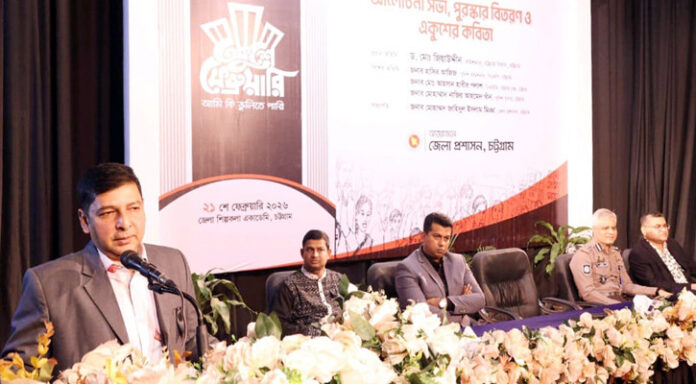 শনিবার (২১ ফেব্রুয়ারি) চট্টগ্রাম জেলা শিল্পকলা একাডেমি অডিটোরিয়ামে চট্টগ্রাম জেলা প্রশাসনের আয়োজনে মহান শহিদ দিবস ও আন্তর্জাতিক মাতৃভাষা দিবস-২০২৬ পালন উপলক্ষে আলোচনা সভা, পুরস্কার বিতরণ ও একুশের কবিতা অনুষ্ঠানে প্রধান অতিথির বক্তব্যে তিনি এসব কথা বলেন।
