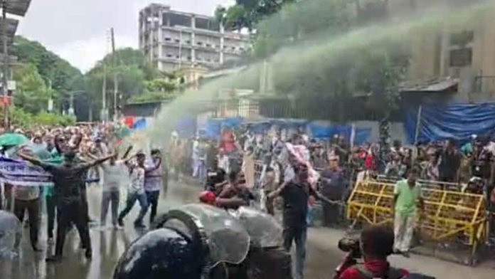 পুলিশের এই হুঁশিয়ারির পরও বিক্ষোভকারীরা সরতে অস্বীকৃতি জানালে জলকামান ব্যবহার করে ছত্রভঙ্গ করার চেষ্টা করে আইনশৃঙ্খলা বাহিনী। পরে একাধিকবার সাউন্ড গ্রেনেড নিক্ষেপ করা হয়। এ সময় আশপাশের এলাকায় আতঙ্ক ছড়িয়ে পড়ে, দোকানপাট বন্ধ হয়ে যায় এবং যানচলাচলে বিঘ্ন ঘটে।