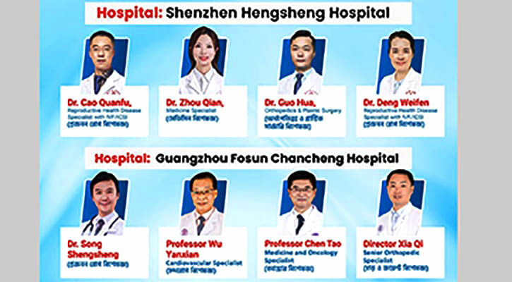 এদিন সকাল ১০টা থেকে দিনব্যাপী চীনের শীর্ষ দুটি হাসপাতাল শেনজেন হেংশেন হাসপাতাল এবং গুয়াংজু ফোসুন চানচেং হাসপাতাল এর বিশেষজ্ঞ থেকে ক্যান্সার, হৃদরোগ, অর্থোপেডিক্স ও প্লাস্টিক সার্জারি, প্রজনন রোগ, মূত্র ও মূত্র নালি এবং মেডিসিন এর জটিল সব রোগের চিকিৎসা পরামর্শ পাবেন বিনামূল্যে।