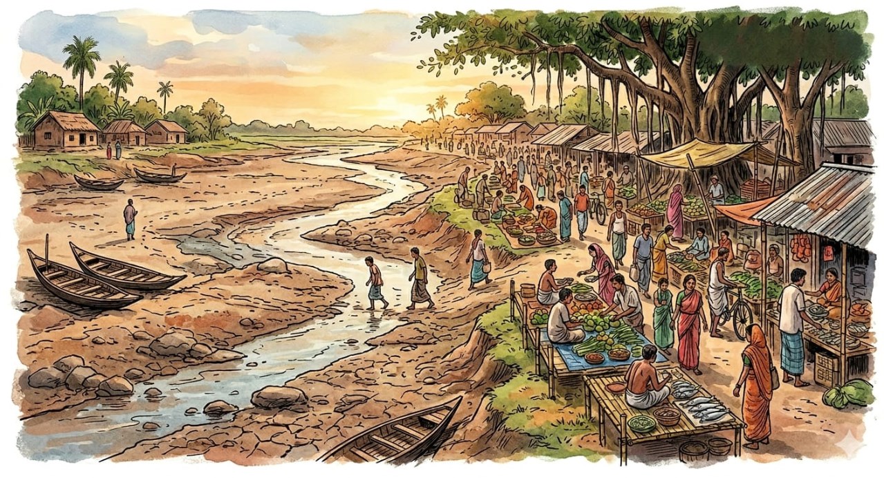 কাঠের সাঁকো থেকে কংক্রিটের ব্রিজ দুপারকে একত্রিত করে দিয়েছে, কিন্তু নিচে যে নদী এখন তাকে খালই বলা যায়, নদীর রূপ আর নেই। দিনেি নে খালও তার প্রকৃত চেহারা হারিয়ে মানুষের বসতি হয়ে উঠছে। হয়তো একটা সময় মানুষ ভুল না করেই বলে ফেলবে ব্রিজ কেনো মাথা উচিয়ে দাঁড়িয়ে। ব্রিজের পূর্বপাড়ে গ্রামীণ মানুষের বাড়িঘর যাচ্ছেতাইভাবে পা ছড়িয়ে বসে আর এপারে অর্থাৎ পশ্চিমদিকে বিশাল হাট। মূল শহরে যাওয়ার ছোট সড়ক, সপ্তাহে দু’দিন হাটবার আর রাত-দিন বাজার বসে। লোকের সমাগম সবদিনই সমান থাকে। দূর-দূর থেকে মহাজন-ব্যাপারী-আড়ৎদারদের বিশাল বিশাল ট্রাক এসে শাক-শবজি আলু-পটল হাঁস-মুরগী গরু-ছাগল ধান-গম ভুট্টা-জব সরিষা-তিল তিশি প্রভৃতি নিয়ে যায়। তারপর আছে মাছের আড়ৎ, সেখানে তো কাজের কামাই নেই। মাছ তো নয় যেন মাছের সমুদ্র, সে সমুদ্রে শুধুই মাছের ছড়াছড়ি। বিভিন্ন খুচরো ব্যাপারীর মাছ আসছে এবং তা আড়ৎদারের কাছে পৌছে চলে যাচ্ছে যথাস্থানে। দূর দূর মোকামে হাটে বাজারে, যেখানে যেমন চাহিদা আর কি!